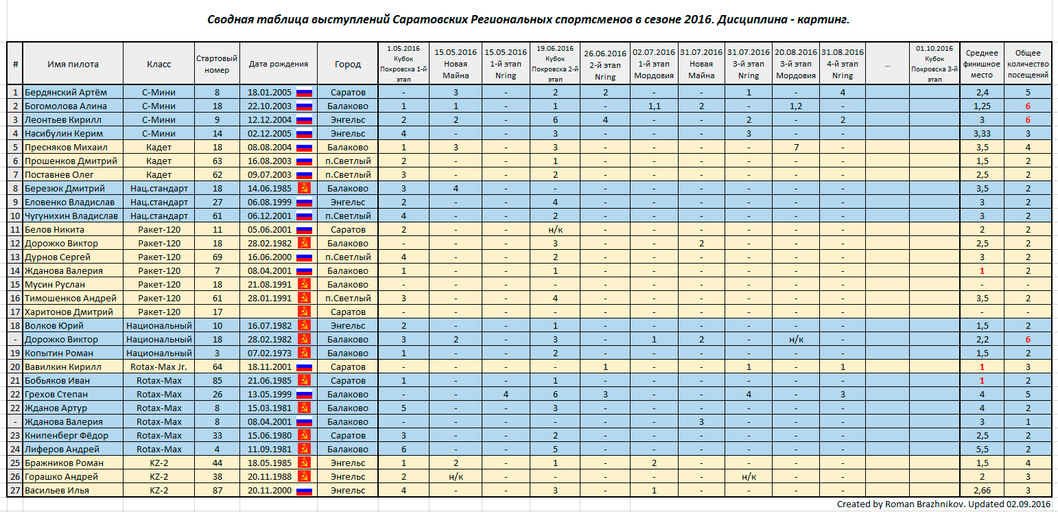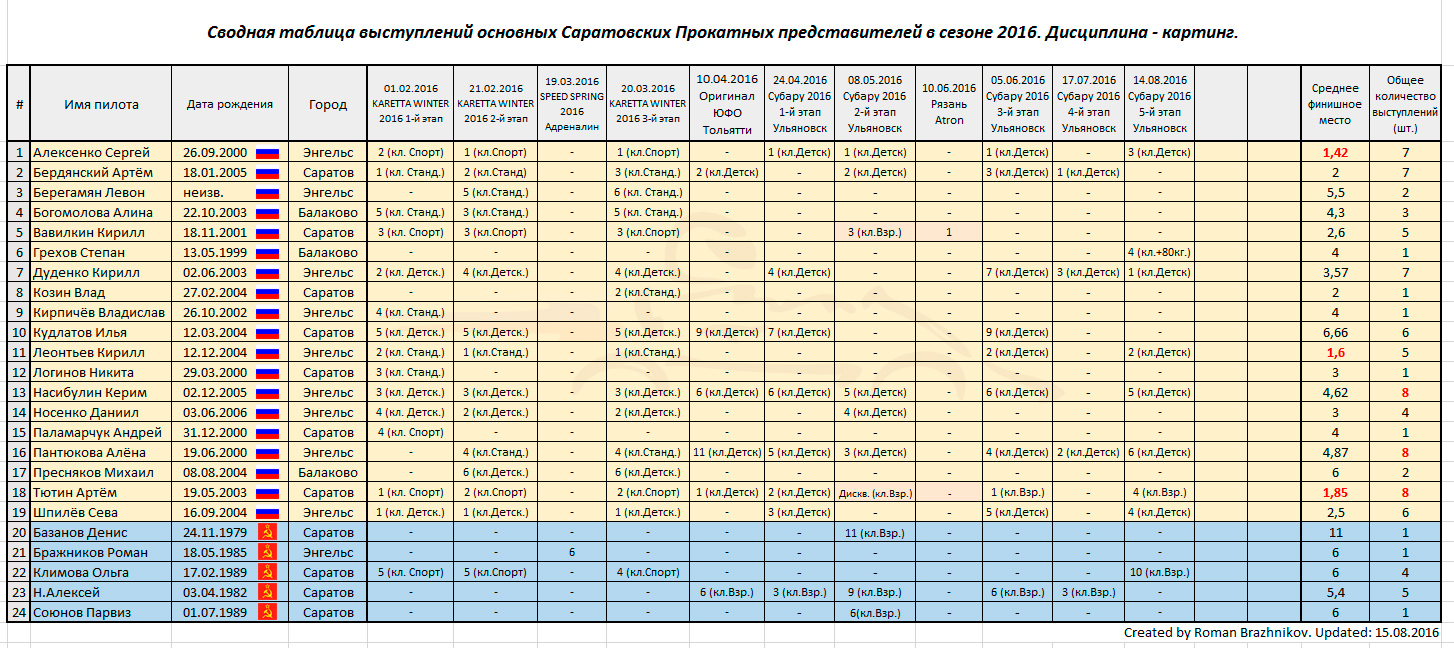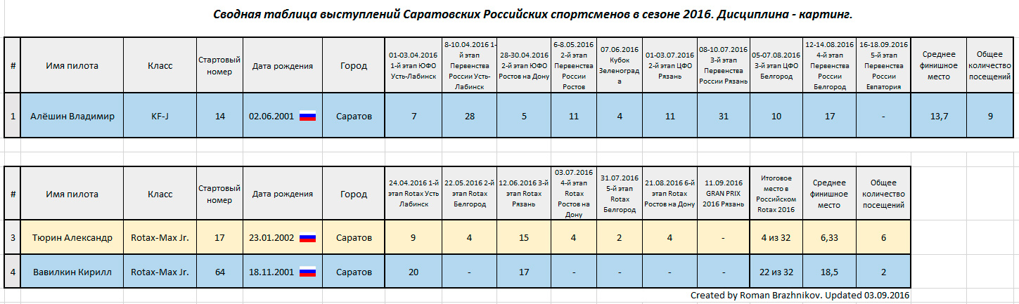 - Сводная таблица выступлений Саратовских Прокатных представителей в сезоне 2016 (от 04.09.2016) - Сводная таблица выступлений Саратовских Региональных представителей в сезоне 2016 (от 04.09.2016) - Сводная таблица выступлений Саратовских Российских представителей в сезоне 2016 (от 04.09.2016) Наступила последняя фаза сезона 2016. В российских соревнованиях осталось 2 серьезных даты - 11 сентября (Российский Гранд Финал Rotax-Max в Рязани) и 16-18 сентября (5-й этап Первенства России в Крыму, Евпатория). Оба Саратовских представителя - Тюрин Александр и Владимир Алёшин, планируют свое участие в предстоящих соревнованиях. ![]() В региональной жизни Саратовских спортсменов наметилась дата 1 октября. Именно в первый октябрьский день, судя по всему, пройдет заключительный 3-й этап Кубка Покровска 2016. Это одно из самых ожидаемых (для многих - единственное) событий для Саратовских Региональных картинговых представителей. С положением дел после второго этапа вы можете ознакомиться на специальной странице нашего сайта ЗДЕСЬ. Также наших Региональных спортсменов ждёт заключительный этап, и итоговый подсчёт результатов на Кубке Нижегородской области по картингу 2016. Подробности о Кубке Nringa 2016 ЗДЕСЬ и ТУТ. ![]() У прокатных Саратовских представителей на осень свои планы, и в первую очередь это еще 3 этапа Ульяновского чемпионата Субару 2016. И если в детском классе судьба титула практически предрешена (Покровчанин - Сергей Алексенко с большой долей вероятности математически выиграет чемпионат уже на предстоящем этапе), то во взрослом классе градус накала событий только начинает увеличиваться. Тютин Артём и Алексей Н. вступают в решающую фазу борьбы за итоговые призовые места Субару 2016. Алексей Н. успел два раза побывать на призовом подиуме в этом сезоне, Артём Тютин начинал сезон в детском классе, потом перешел во взрослый, и был дисквалифицирован на первом же этапе (нашумевший скандал начала сезона Субару 2016 можно вспомнить ЗДЕСЬ), но потом сумел реабилитироваться и выиграть следующий этап. Если юный Саратовский пилот не пропустит ни одного осеннего этапа - то он имеет все шансы побороться за высокие места по итогам чемпионата, так как в зачет берется 5 лучших, из которых у Артёма 1 победа, одно четвертое место и три предстоящих соревнования. Хотим напомнить всем "кто не в теме" - Ульяновский чемпионат Субару хоть и является прокатным - но собирает у себя далеко не только любителей, но и одних из самых лучших спортсменов Поволжья и средней части России. В разное время на Субару выступали: Егор Санин, Дмитрий и Егор Охотниковы, Владислав Зинькович, Виктор Сандыбаев, Игорь Огуленко и т.д. ![]() Предстоящий этап, который состоится 11 сентября, примечателен тем - что в нем впервые, после скандальной ситуации в мае месяце, на трассе в одном классе вновь сойдутся два Саратовских представителя - Вавилкин Кирилл и Артём Тютин. Масла в огонь их противостояния подольют Алексей Н. и Ольга Климова - которые непременно ждут момента, чтобы воспользоваться ошибками в борьбе между собой двух юных горячих Саратовских пилотов. В детском классе также ожидается большое количество Саратовских представителей. | |
