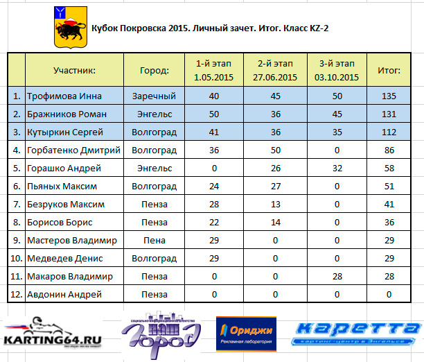 Наполняемость в KZ-2 на этот раз была далеко не рекордной. Многие Волгоградские пилоты, прочувствовав скорость южных картодромов – уже не готовы были снова вернуться на площадные гонки. В итоге честь Волгоградской области в одиночку представлял Кутыркин Сергей. Он же входил в тройку претендентов на чемпионство по итогам Кубка Покровск 2015 в KZ-2. По итогам заездов у Сергея – третья позиция как по итогам этапа, так и по итогам всего чемпионата. Недосягаемой для всех на этот раз стала Зареченская спорстменка Трофимова Инна – выиграв два заезда она оформила победу в этапе, и чемпионате. Бражников Роман стал серебряным призером обоих зачетов. Уже во второй раз, после длительного перерыва, вернулся на Энгельсскую трассу Покровский спортсмен - Горашко Андрей! Гонка для Андрея не задалась, скорость была неплохой – но встреча с покрышкой во втором заезде перечеркнула все старания Андрея. Итог – четвертое место на 3-м этапе Кубка Покровска 2015. Пензенский представитель Макаров Андрей все заезды боролся со своей техникой, но подобрать подходящие для себя настройки так и не смог – лишь пятое итоговое место.