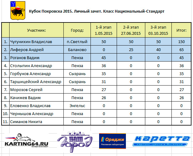 Пару слов о третьем этапе. Мне очень нелегко дался этап подготовки – особенно последняя неделя. Как бы я давно работаю по многу, но это была особенная, круглосуточная, неделя. После такого опыта я точно уяснил для себя одно – я не готов с головой уходить на пенсию, в организаторы. Это неизбежно случиться в будущем, но не сейчас. В следующем году мы постараемся построить работу так, чтобы я выступал в основном в роли консультанта. Я спортсмен, и не собираюсь на пенсию. У меня воспитанники в закрытом парке – за результатами которых надо следить. На следующий сезон именно этим я и займусь. По организации – осенний этап конечно на голову выше летнего. Что очень понравилось с точки зрения пилота – реально большое количество судейских постов с полным набором флагов. И (о чудо!) впервые в Энгельсе четкие зеленые флаги после желтых – я сначала даже растерялся, но потом обрадовался – наконец-то! Трасса интересная, хоть и немного затычная. В моем классе на этот раз Трофимова Инна была просто недостижима. На протяжении двух заездов я пытался что-то сделать. но не мог даже приблизиться. После второго заезда Никита Густешов подсказал, что на спущенном заднем колесе ездить два заезда ему бы уже надоело, после чего мы его подкачали. Это действительно помогло – со своего времени я убрал чуть больше секунды, и судя по отрыву от Кутыркина Сергея на финише заезда – у меня был бы шанс зацепиться за Инну, однако к тому времени она уже выиграла этот этап, и спокойно выступала в качестве зрителя. Мои поздравления Инне с двойным чемпионством на Кубке Покровска 2015! С нетерпением жду начала следующего сезона!