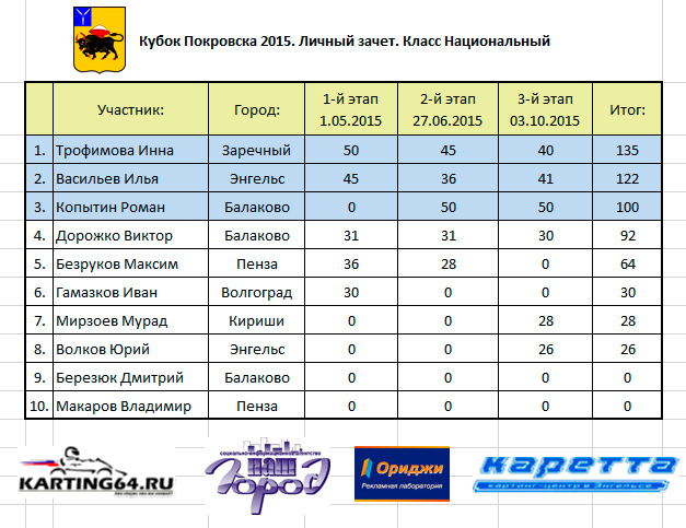 Заезды в классе Национальный проходили по давно знакомому всем сценарию – где основные сражения, по-прежнему, разворачивались между Балаковским ветераном – Романом Копытиным, и его более молодыми соперниками – Трофимовой Инной (г.Заречный) и Васильевым Ильей (г.Энгельс). И не собрал бы этот класс столь много любопытных взглядов, если бы не два интересных момента. Первый – Волков Юрий. Эту легенду Саратовского картинга класса Союзный середины девяностых, начала 2000-х на гоночных треках давно небыло видно, поэтому к Юриному возвращению конечно был прикован интерес всех тех “кто в теме”. Второй момент, по своей статусности быть может даже затмевающий первый - это участие в Энгельсских соревнованиях спортсмена из Ленинградской области – Мирзоева Мурада! Так далеко география Покровских участников не забиралась ни разу за все время проведения областных соревнований. Конечно, участие этих спортсменов было главной интригой класса Союзный на этот раз. Фурора не смог произвести не один из спортсменов. У Юрия Волкова на протяжении всех трех заездов наблюдались проблемы с техникой, все же за время его отсутствия на трассах соперники смогли довести техническое состояние своей техники из кустарного-подпольного образца начала 2000-х, в практически идеально отточенное для этого класса машин в настоящее время, да и уровень пилотажа спортсменов-соперников сейчас далеко не на том (считай никаком) уровне, на котором Юрий привык видеть во времена его выступлений – практически всегда обгоняя всех своих соперников на круг уже к середине заездов. На выступлениях Ленинградского гостя сказалась дальняя дорога – еще вечером перед соревнованиями Мурада беспокоили боли в области спины, как потом оказалось - некоторые нервные окончания были либо зажатыми, либо простуженными. Выступать в таком состоянии было тяжело чисто физически, плюсом ко всему, по признаниям самого Мурада, он был не совсем готов именно к такой площадной гонке – его стихия это картодромы. В итоге лидерство, уже по доброй традиции, захватил Копытин Роман. Лишь в первом заезде Покровчанин Васильев Илья смог удержать за собой Балаковскую ракету и финишировать на первом месте, остальные же два заезда Роман выиграл подчистую. Справедливости ради стоит отметить – на этот раз с чудом Васильевской инженерной мысли - единственным в России симбиозом мотора ЕМ и кроссовой Ямахи, в простонародье сразу же ласково названной – ВасХондой, случилась беда – температура охлаждающей жидкости по ходу заезда достигала 120-130 градусов. Конечно ни о каких серьезных результатах, на таком кипящем чайнике с радиатором, на этот раз речь, для семейного подряда Васильевых, не шла. На привычном для себя, по ходу сезона 2015, четвертом месте все заезды провел Виктор Дорожко – представитель города Балаково. Три четвертых места по итогам заездов, и четвертое по итогам этапа. Зареченская спорстменка – Инна Трофимова уверенно провела заезды, стараясь особо не перестараться – на кону стояла высокая цена – Чемпионство в Союзном по итогам сезона 2015. Свою программу Инна выполнила – заняв по итогам этапа 3-е место, по итогам чемпионата 1-е – став чемпионом Кубка Покровск 2015 в классе машин Национальный. Отметим, что такую возможность – буквально без всякой борьбы, подарил Инне Роман Копытин – пропустив первый этап,