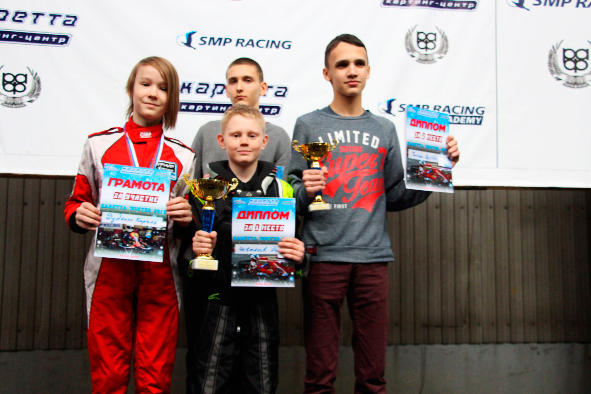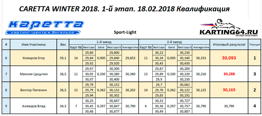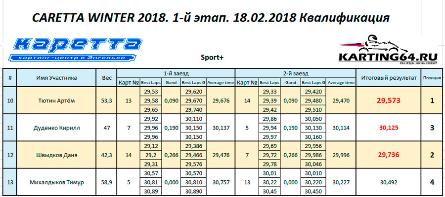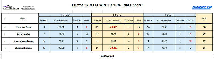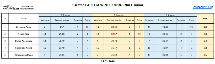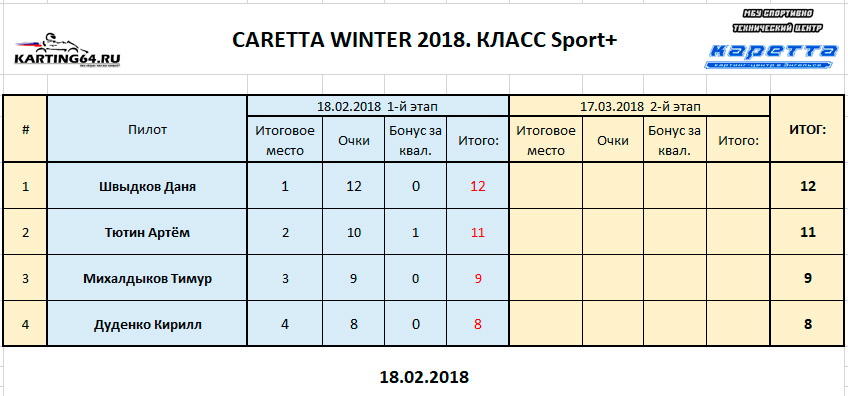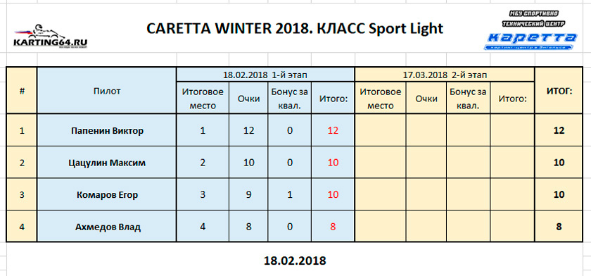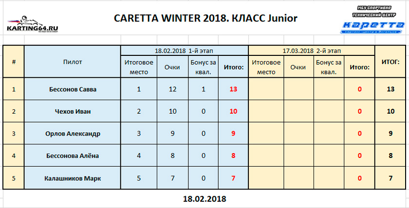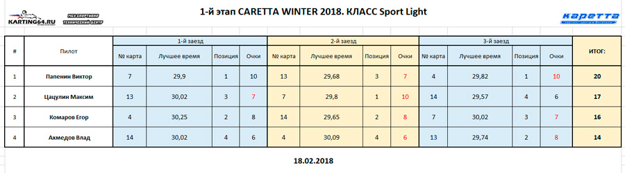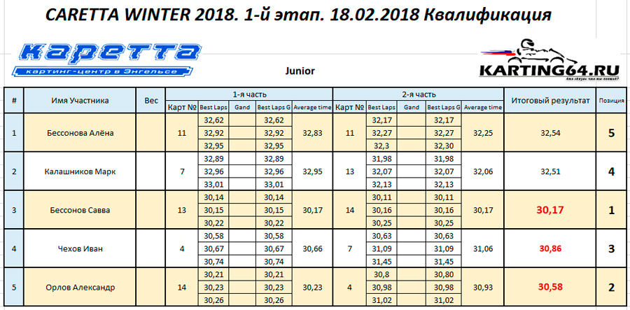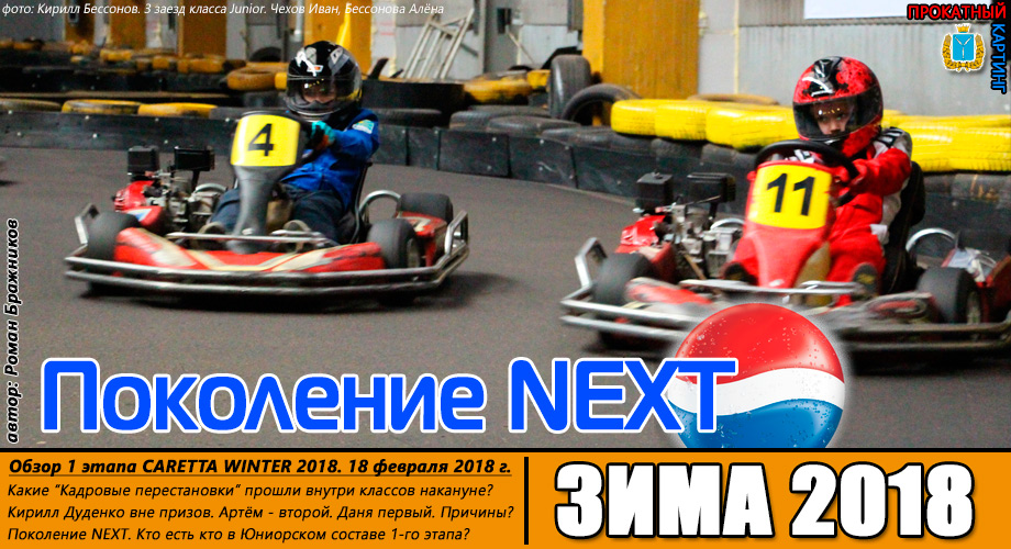 ![]() ![]() - Регламент чемпионата"CARETTA WINTER 2018" - Фотоотчёт 1-й этап "CARETTA WINTER 2018" - Видео с камер пилотов на нашем канале Youtube 18 Февраля 2018 года в Энгельсском картинг-центре Каретта состоялся 1-й этап Зимнего традиционного детского чемпионата по картингу “Caretta Winter”. “Caretta Winter 2018” стал пятым по счету зимним детским Кареттовским чемпионатом. На этот раз чемпионат взял свой старт довольно поздно – только в феврале месяце, однако окончание сезона 2017 никак нельзя назвать пустым. Два подряд соревнования в формате Time Attack захватили как прошлую конфигурацию – так и абсолютно новую, появившуюся практически под самый новый год. Декабрьское одиночное соревнование, также носившее название Caretta Winter 2018 (не путать с нынешним чемпионатом), и вовсе стало первым в истории, для Энгельсского картинг-центра, Межрегиональным соревнованием! В декабре 2017 года Энгельс встречал гостей из Волгограда – семейный подряд Орыщенко, а также из Ульяновска – Башмакова Яна, Аксёнов Артём и Аксёнов Андрей. По оценкам многих присутствующих тогда зрителей, болельщиков и гостей – этап удался на славу! Это было прекрасное окончание достойного сезона 2017. Сезон 2018 начался немного скомкано, и виной тому стала внезапно вышедшая из строя телеметрия на трассе. Общими усилиями решить эту проблему удалось лишь к началу февраля. Однако начало первого детского первого чемпионата в сезоне 2018 вновь пришлось немного сместить. Дело в том – что еще с ноября месяца Кареттовская школа картинга выставила 2 команды, состоящие из лучших старших ребят и тренера – и один из этапов как раз пришелся на 11 февраля. Итог – старт первого соревнования в сезоне 2018 был запланирован на 18 февраля. По количеству участников этап получился не рекордным. Не смогли посетить этап приглашенные гости из Волгограда, Ульяновска, Самары, Пензы. Подавляющая часть гостей пропустила этап по причине болезни пилотов, и практически все в один голос заверяют что обязательно приедут в гости на 2-й этап в марте. Местные пилоты также не в полном составе вышли на старт соревнований. Однозначно можно сказать одно – младший состав юных гонщиков постепенно занимает прочные позиции во всех классах, и сильно подтягивается как по уровню пилотажа, так и по уровню борьбы на трассе. ![]() Класс Junior на этот раз стал самым многочисленным по количеству заявленных юных пилотов и пилотесс. Состав: Бессоновы Савва и Алёна, Чехов Иван, Орлов Александр и Калашников Марк. Сложнее всего в этом классе пришлось Алёне и Марку – всё же возраст дает о себе знать. Однако не всё так однозначно было по ходу финальных заездов, как могло бы казаться при подготовке к соревнованиям. Алёна на этот раз действительно старалась изо всех сил, что было видно как по её борьбе на трассе, так и по её состоянию после заезда. Больше всего к Алёниному состоянию приходилось выражение “выжатый лимон”, а мы все хорошо знаем – чтобы достичь такого состояния надо действительно выкладывается по полной программе по ходу всего заезда. Так что, несмотря на то – что на подиум попасть в этот раз не получилось – главную для себя цель юная Покровчанка выполнила на все 100 процентов! Калашников Марк – самый юный участник соревнований. Накануне соревнований Марк впервые пересел с детской машины на взрослую, и уже после первых проведённых тестовых заездов стало понятно – за руль мален